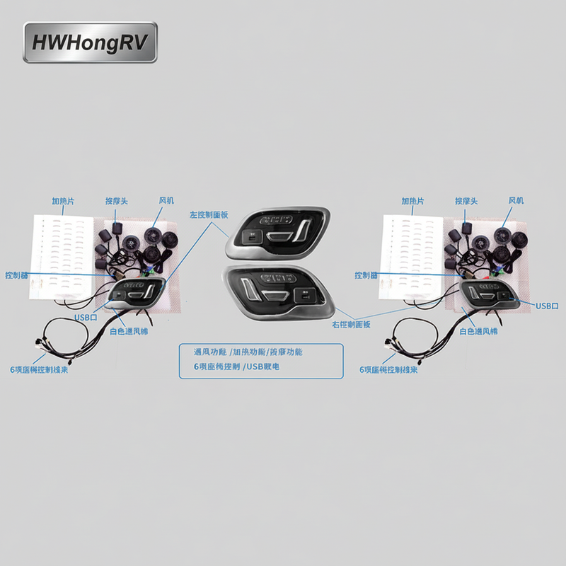 Kit composition | Switch panel, ECU controller, wire harness, fans, heating pads, massage units |